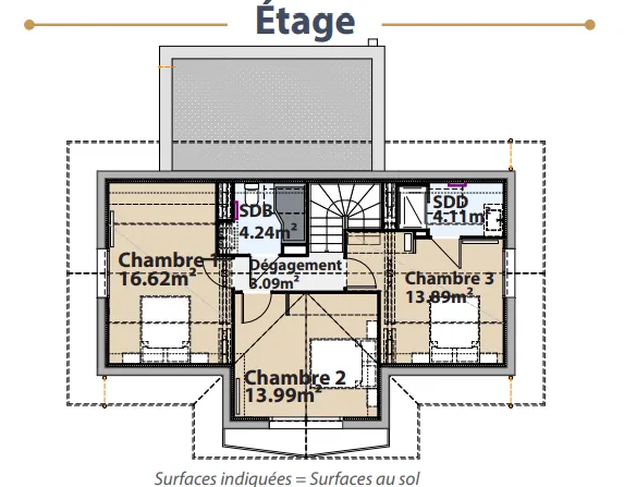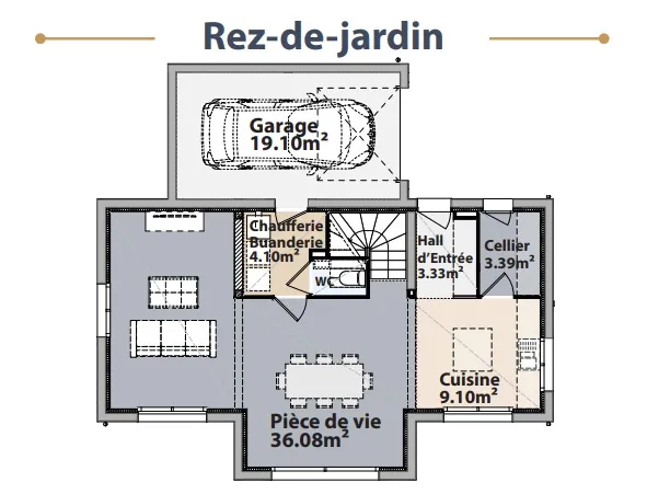 Descriptif Surface habitable 107 m² Surface utile 113 m² Pièce de vie + cuisine 45 m² 3 chambres dont une suite parentale 1 salle de bain 1 salle de douche 2 WC 1 cellier 1 chaufferie / buanderie Garage 19 m² Maison connectée Modèle de maison MEDZA Demande de renseignements Téléchargez la brochure