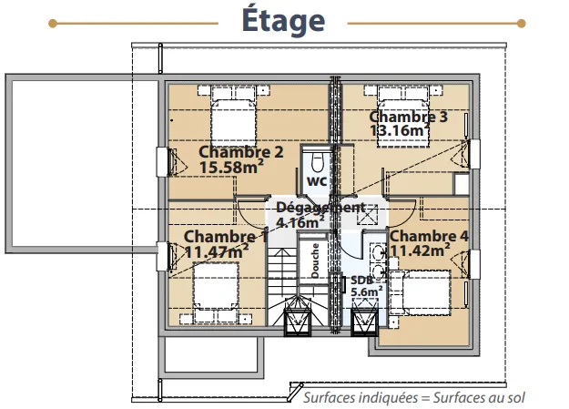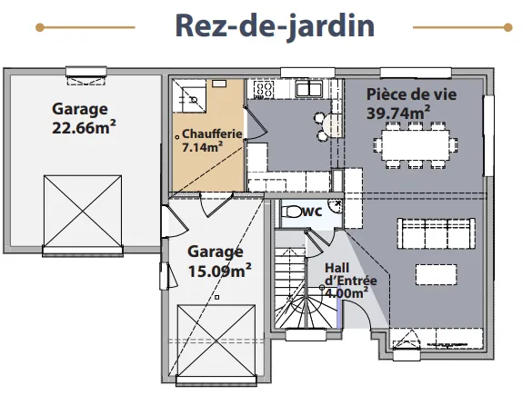 Descriptif Surface habitable 102 m² Surface utile 114 m² Pièce de vie + cuisine 40m² 4 chambres 1 salle de bain 2 WC 1 chaufferie 2 Garages 23 m² et 15 m² Maison connectée Modèle de maison STELLA Demande de renseignements Téléchargez la brochure
